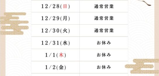 年末年始の営業日のお知らせ
