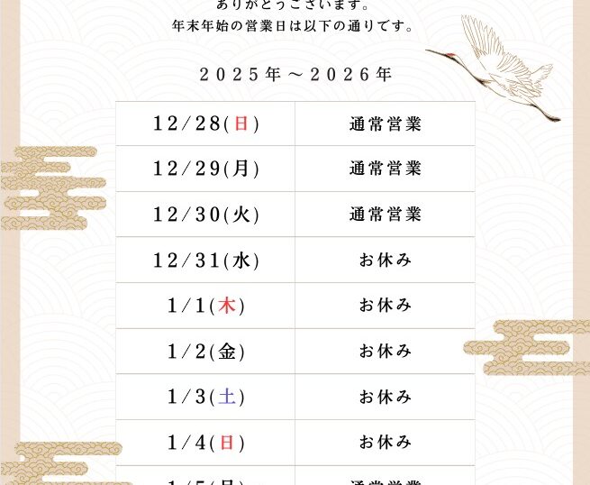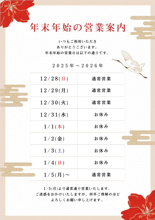 年末年始の営業日のお知らせ