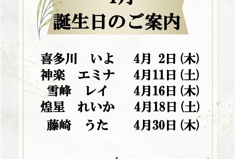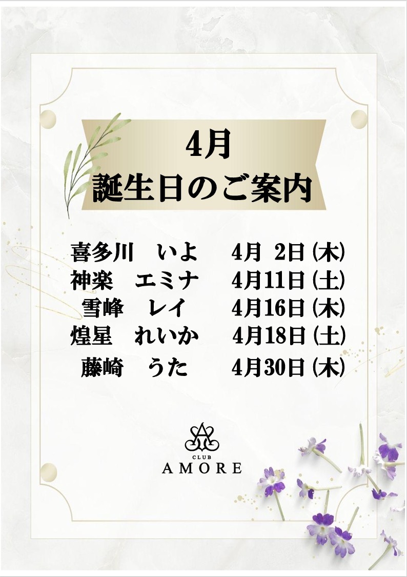 4月 バースデーのお知らせ2026年4月7日club_amoreバースデーイベント日頃のご愛顧への感謝を込めて、ささやかなひとときをご用意しております。桜が咲き誇り、春の訪れを感じる季節となりました。お時間がございましたら、ぜひお気軽にお立ち寄りください。スタッフ一同、皆さまのご来店を心よりお待ちしております。