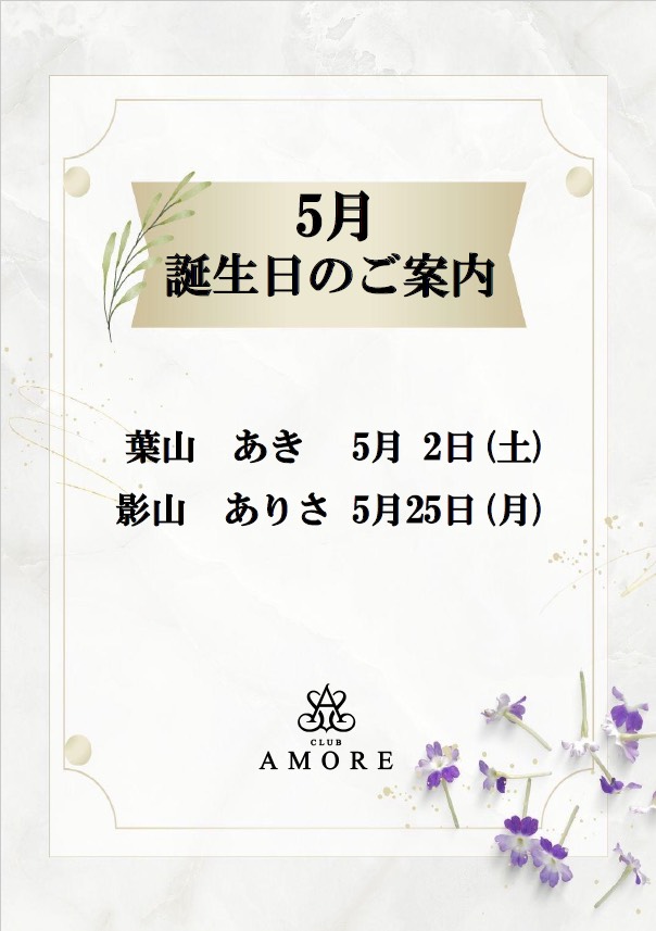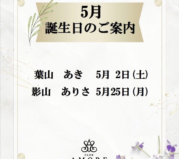 5月 バースデーのお知らせ2026年4月24日club_amoreバースデーイベント日頃のご愛顧への感謝を込めて、ささやかなひとときをご用意しております。風薫る爽やかな季節となりました。お時間がございましたら、ぜひお気軽にお立ち寄りください。スタッフ一同、皆さまのご来店を心よりお待ちしております。
