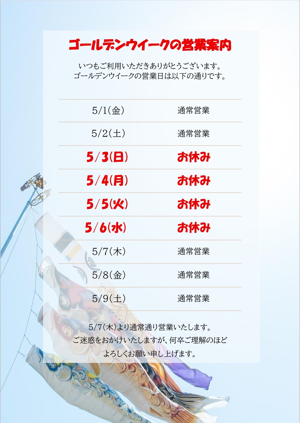 GW 店休日のお知らせ